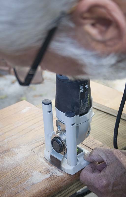 The Plunge Base seemed particularly goodย for cutting out a square for a newel post in the bottom tread of a wooden staircase. This would work on new construction but would be even more apropos if you were keeping a tread and replacing just the post. To test this out, we took a piece of 5/4 tread and drew out a square for our post. Then we grabbed the plunge base and attached itโan easy process.