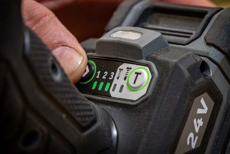 For the size, the tool feels a bit heavier than weโre used to. Bare, it weighs 2.8 pounds and moves up to 4.1 pounds with a 2.5Ah battery and 4.9 pounds with a 5.0Ah pack. Part of the weight comes from working with a 6-cell battery system instead of 5 cells the way 18V and 20V Max tools do.