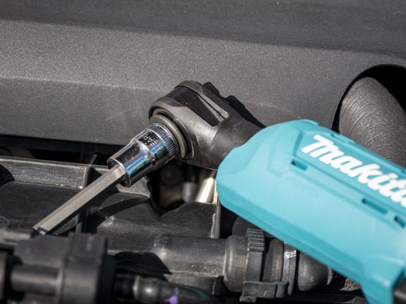 You can also use something like this Makita cordless ratchet. We recommend using one with a variable speed trigger or paddle switch so you can feather it, particularly on models that are in the upper range for torque.
