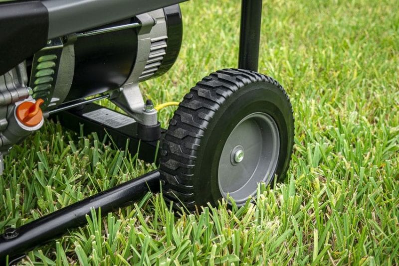 The generatorโs frame is made from 1 1/4-inch steel tube, giving it plenty of rigidity and strength. 9 1/2-inch never-flat wheels let you roll easily over most surfaces. While they can sink in a bit on soggy ground, theyโre effective on hard surfaces and firm ground.