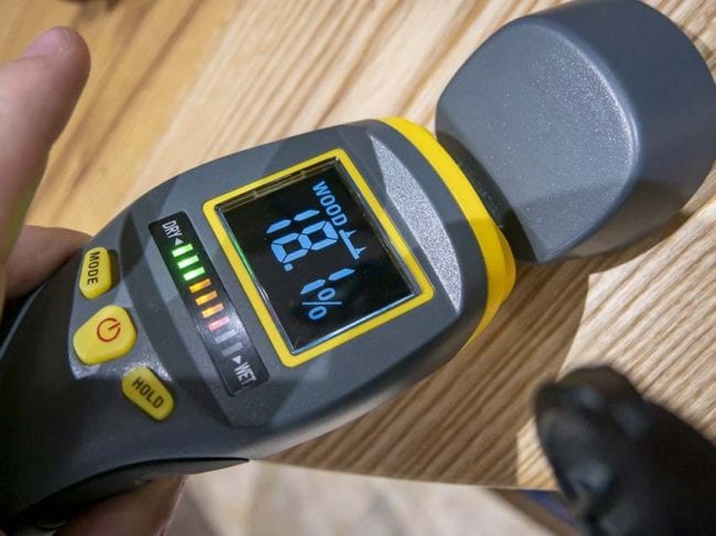 The MM7 General Tools moisture meter has a hold function that keeps your reading on the screen. It also auto-calibrates for detecting materials at least 3/8โ€ณ thick. You can check the calibration by removing the pin cover and testing the pins in the calibration holes. If the reading falls outside of the acceptable range (17.3% โ€“ 19.3%), itโ€™s no longer reading properly.