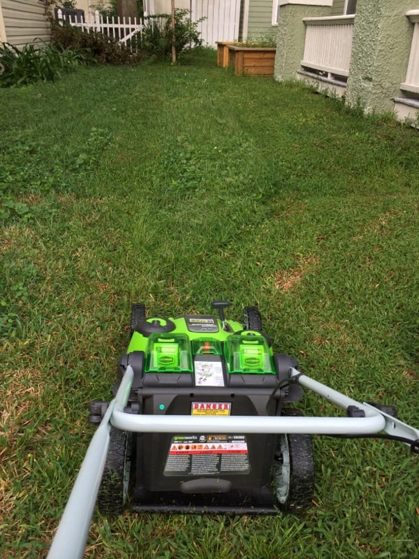 My first impression upon testing the mower was that it cut quickly and sounded different than any mower I had ever used before. It’s significantly quieter than a two-cycle combustion engine, but by no means is it “silent”. As alluded to earlier, I really didn’t miss the self-propulsion of my gas mower simply because the GreenWorks G-Max 40 V Twin Force mower is so light and maneuverable. I have some hills in my yard, and though they aren’t terribly steep, they gave me an opportunity to use the GreenWorks on something other than just level ground.