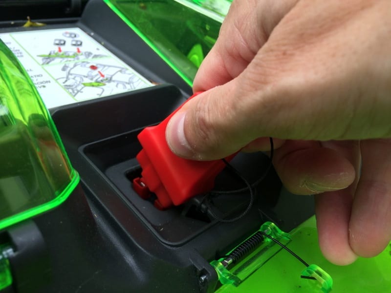 Height adjustment, which you should do before you key up the mower or even insert the batteries, is easily accomplished with a shifter located on the side of the mower’s top shell. I was able to grasp the side of the mower and ease it up or down to any height desired. For my testing I used the center height position.