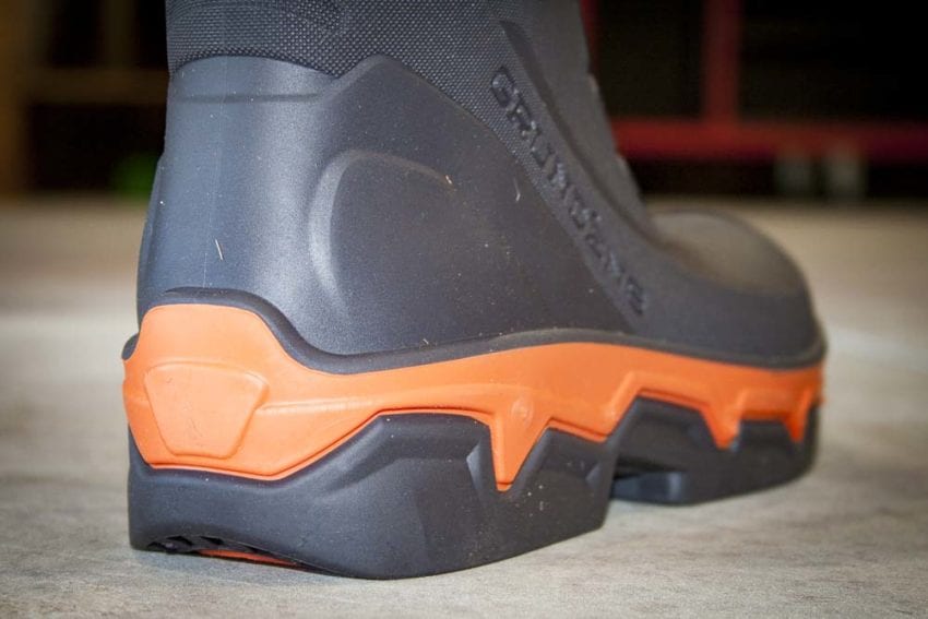 Theย Grundens upper is an injection-molded synthetic rubber boot. It feels quite durable but itโs also pliable enough to be folded down toward the ankle when you donโt require the full height. The toe cap is rigid, but itโs not a safety boot. Youโll notice a 1-inch wide band around the shaft that at first looks like decoration. But itโs actually a removable silicone band that either holds the pant near the knee, out of the muck, or holds the pant tightly around the boot ankle.