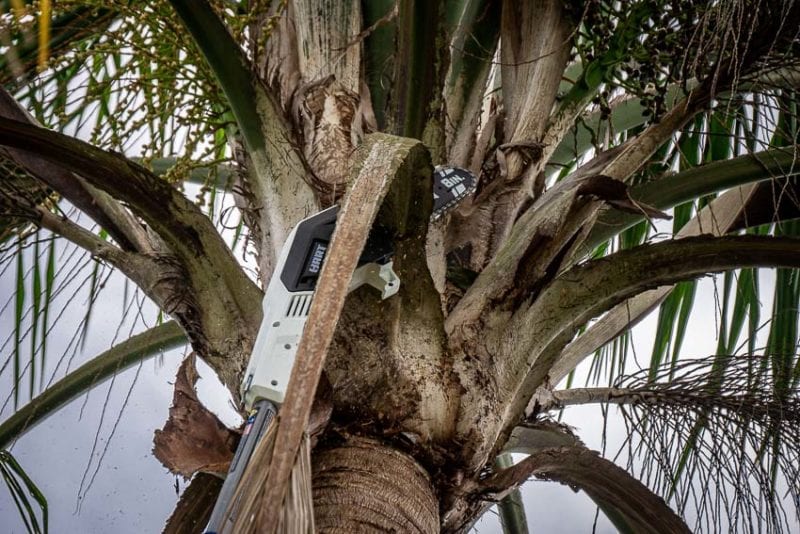 Continuing on into the hassle-free line of Hart 20V OPE tools, we have the 8-inch pole saw. Extending up to 9.5 feet, this oil-free saw seemed like the perfect solution for tackling the higher-hanging overgrowth on some of our crepe myrtles and palms around the shop.