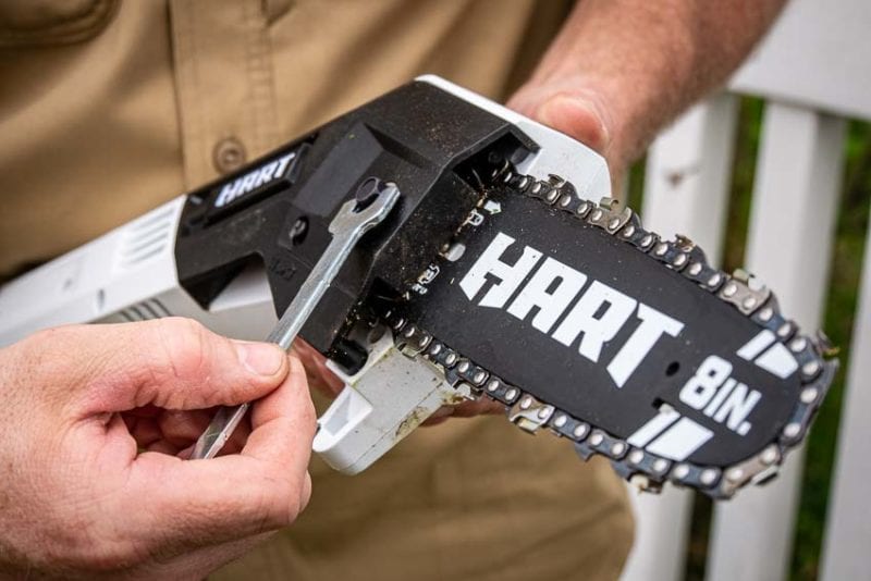 The Hart 20V Pole Saw features an 8โณ bar and chain that can tackle branches up to 6โณ thick. You have your chain tension adjustment and bar nut that can both be fiddled with via the scrench that stores away at the back of the cutting head.