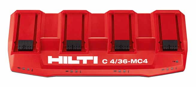 The new Hilti Multi-Bay Charger C4/36-MC worksย with all Hilti lithium-ionย batteries (though 12V batteries will need an adapter) and is designed toย keep contractors productive for the entire work day. The smart charger filters all power to the first battery placed on the charger. In just 25 minutes, the charger can kick theย battery up to 80% capacity. Once the first battery is completelyย charged, the systemย then charges the remaining batteries in the order they were installed.