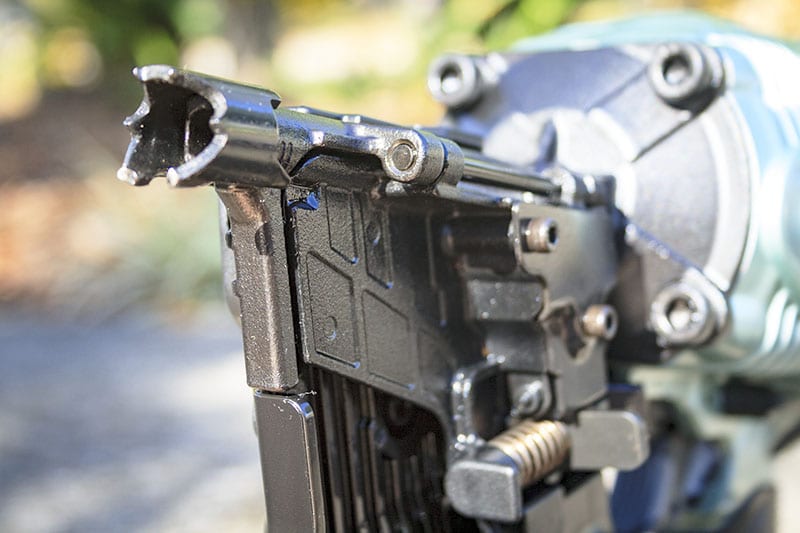 The side-loading magazine tilts out slightly for easy loading just like the Metabo HPT Siding Nailer and accommodates 200-300 wire-collated nails. Unlike the siding nailer, however, the magazine isnโt transparent so itโs not possible to see how many nails are left on the coil.