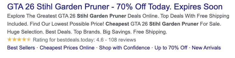One of the most popular ones takes you to a page that looks legit and seems to offer the pruner at a crazy-good price of $20 to $50. But when you order, you wait weeks or even months to find out that itโ€™s a cheap knock-off. It looks the same, and itโ€™s even the same color scheme. Itโ€™s just not a Stihl and is much lower quality.ย