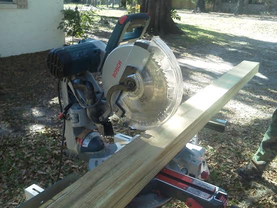 We set up the Bosch GCM12SD 12โ€ณ Miter Saw in the driveway. We then proceeded to cut our main support beam to exactly 10 feet in length, making it perfectly square. The 4x4s came at the length we needed, so we drilled our 1/4-inch holes for the through bolts. To make sure that the hole was flush for the main beam and main supports we set all three boards precisely where they were square and level before drilling.