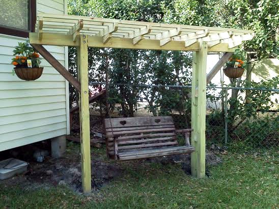 An article on how to build a pergola swing wouldnโ€™t be complete without the finishing touches. After fastening the slats to the top using deck screws, we replaced the swing. It looked fantastic, but just to add a little touch of color, I picked up materials to make hanging baskets from either end. Some Delphinium, Lantana, and Zinnias ensured the greatest color combination possible: blue and orange for my Florida Gator-loving Mama.