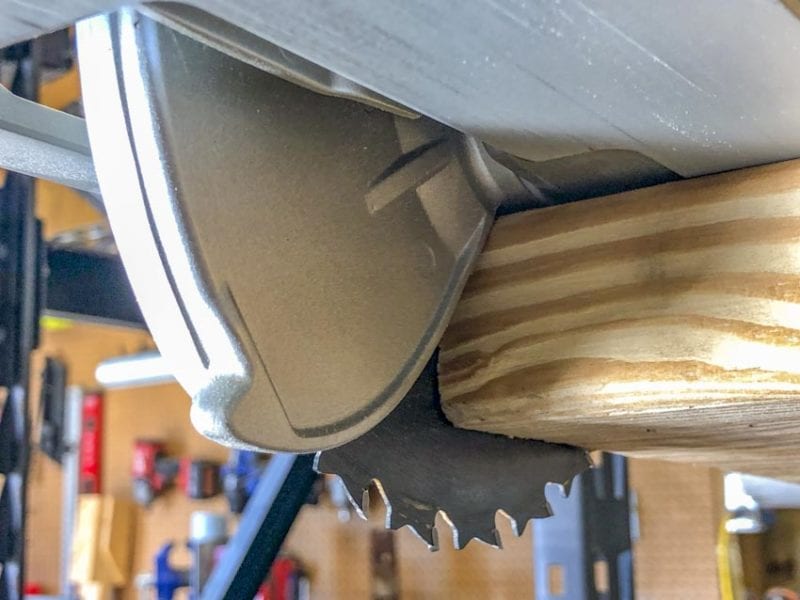 If you feel a hesitation or the saw wants to lift shortly after you start your cut, thatโs usually the guard hanging up. Look for the small lever and push it forward to help the guard get started.