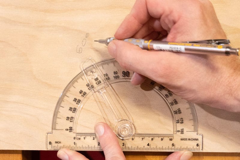 To use the rafter square as a standard protractor, simply pivot the tool until the indicated angle equates to whatever measurement you need subtracted from 90. This means if you need a 60-degree angle as shown below you use 30 degrees on the rafter square.