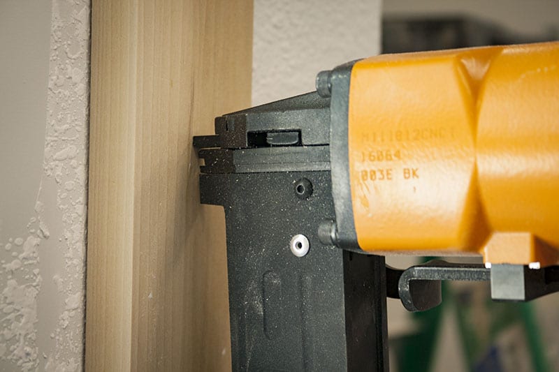 Nailers have a safety mechanism built into the bose of the tool. Pressing this against the material frees you up to pull the trigger and fire a nail. With most T-nailers you wonโt have to worry about protecting the surface of the material. As a result, most donโt include those small plastic nose guards you often see with finish nailers. If, for some reason, you want to put one of these on, be sure to disconnect the air from the tool before you touch the nose of the nailer. You donโt want to misfire into your hand!