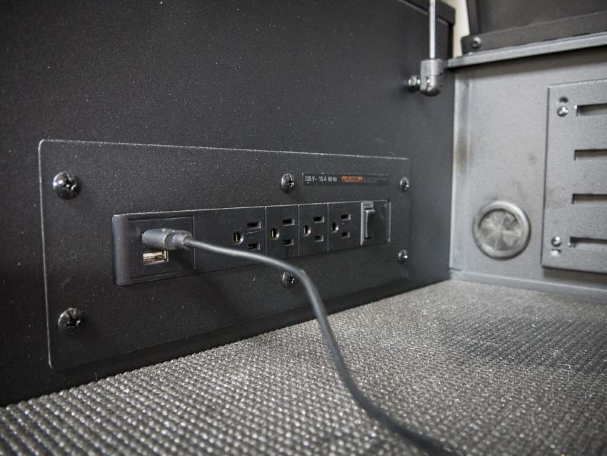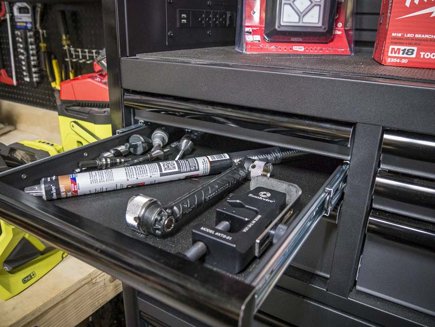 One thing thatโs becoming more common in some consumer-orientedย tool boxes is better power management. Now, manufacturers are adding USB to that as well. Weโve seen lots of tool chests where manufacturers strap a standard power strip to the inside. Thatโs fine, and it presents a good solution. The Milwaukee 60-inch mobile work station uses this method as well as the Husky workbench. The aforementioned Husky 60-inchย mobile workbench has a 6-outlet, 2 USB power strips on the right side for plugging in chargers and other devices. The 52-inch Husky tool chest and cabinet combo has two 4-outlet and 2 USB power strips. One is located on each side of theย topย chest. The 56-inch tool chest goes one further and places a power strip across the entire back of the top chest. This is by far our favorite method for providing much-needed power for chargers and devices.