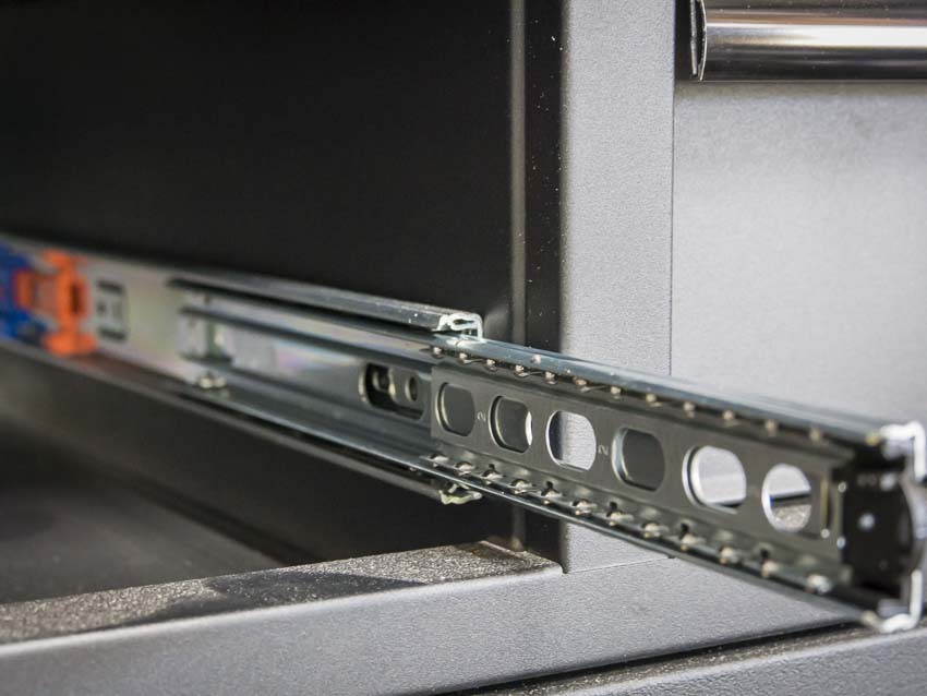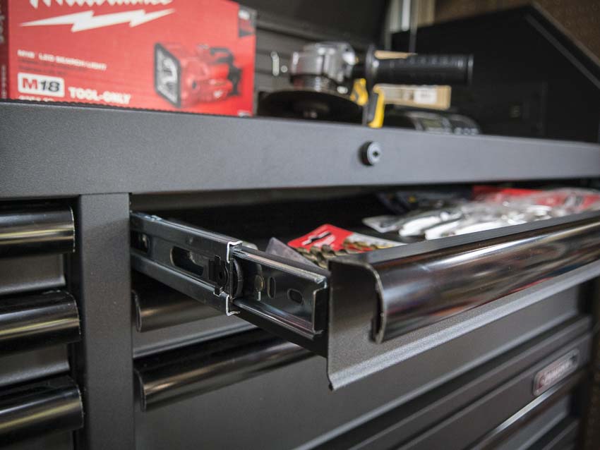 The drawers also feature very nice ball-bearing slides (see the photo for why these are the smoothest drawers weโve yet tested on a Husky). Theyโre taller than prior models, with more supportโup to 200 pounds. The edges of the steel drawers are nicelyย rolledย over on both the tool chest and the Husky workbench. This gives them significantly more strength, so the slides arenโt the only thing keeping them straight. Speaking of the slides, theyโre riveted into the sides of the drawers, and we didnโt feel a lot of play from side to side. The drawers themselvesย have aย very stable and deliberate movement.ย They measuredย aboutย 0.0415โณ in thickness (in line with the 19 gauge steel rating). Taller bottom drawers include two slides for better stability and weight handling.