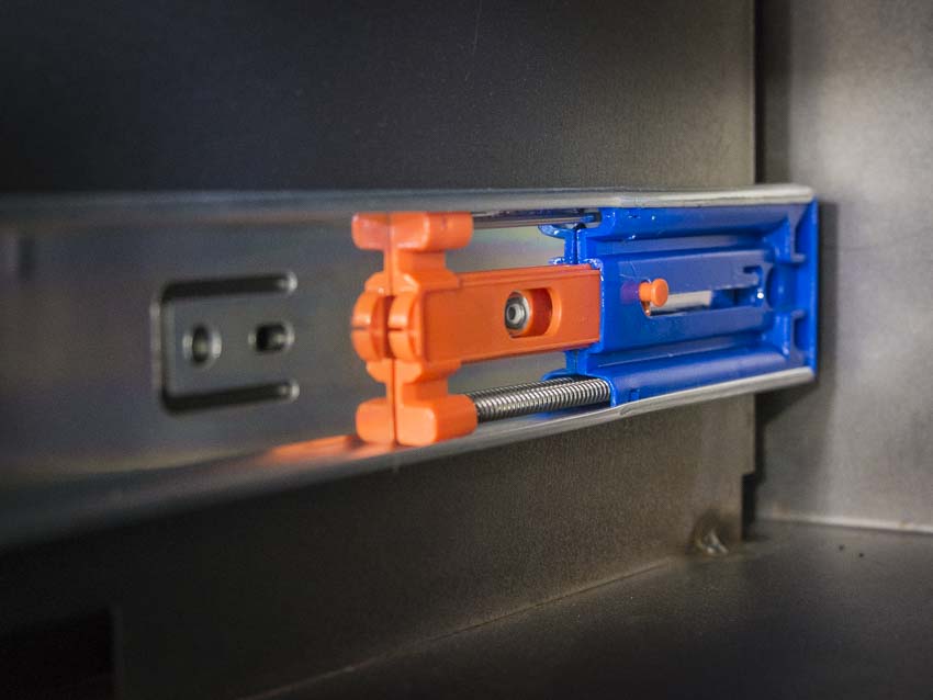 The drawers have a really nice soft-close feature. Iโm often surprisedย why more toolboxes donโt feature this. If youโre not doing a positive handle lock, then soft-close is the way to go. It allows you to shutย the drawers with some force while not tossing your tools all over the place. The mechanism then sucks the drawer in all the way without bouncing your tools. Ourย sockets and wrenches always end up in a mess at the back of the drawer.