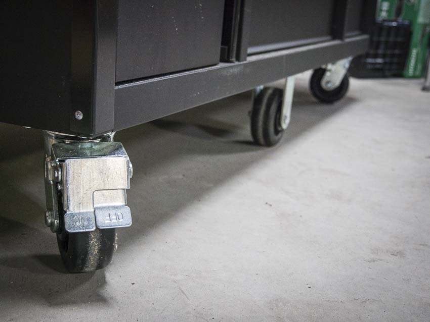 Theย six casters are mounted to angle iron steel supports underneath the floor of the baseย cabinets. This is the case for both Husky tool boxes as well as the 60-inch work bench. Weโve seen toolboxes where the casters were attached to the bottom sheet of steel with little or no support. Add too much weight and itโs likely to buckle. This is not the case with the Husky tool boxesโand why theyโre rated up to 2,500 lbs load capacity.