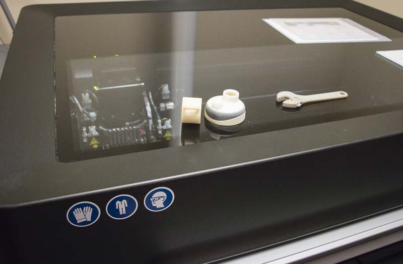 In the first room we toured, we saw machines for digital optical inspection of accessories and parts, and a coordinate measuring machine to precisely measure components. Tom Shear, a prototype engineer, discussed his work in rapid prototyping—a process that transforms a product from CAD drawings to 3D-printed models to painted finishes. One machine works with two different resins and can overmold them to create a product you can handle and experience. It can, for example, use a dissolvable (water-soluble) portion to enable fully functioning tool prototypes with moving parts. A great example was an adjustable wrench that was printed all at once in about two hours, and which actually works.