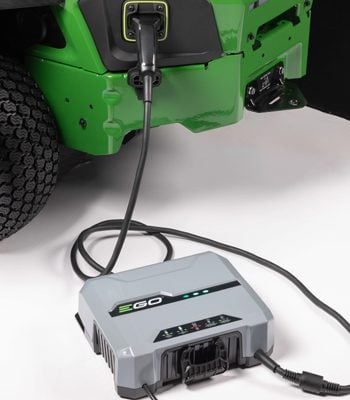 Also included with this mower is an EGO ZTrak external charger, which allows you to charge the batteries directly onboard the mower. It plugs into the charging port next to the battery housing to charge all ported batteries at once. This method charges a fully depleted set of batteries in 4 to 5 hours.