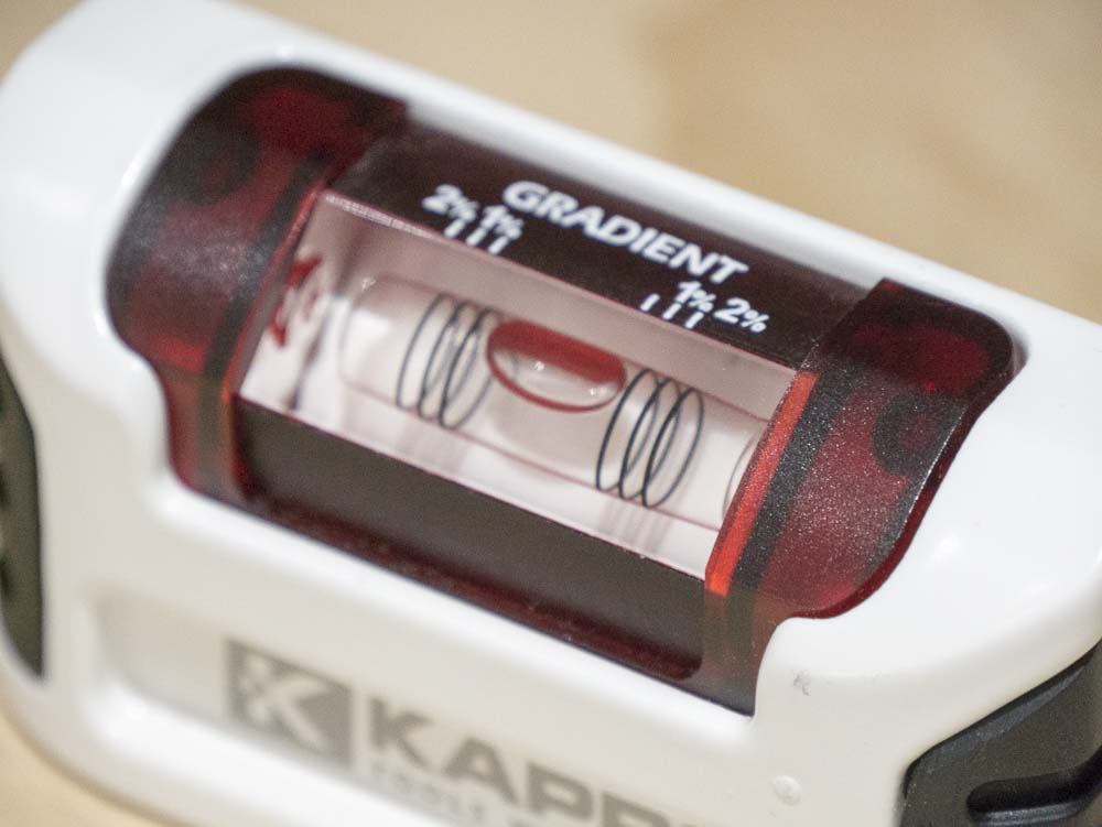 Kapro gives you 1% and 2% gradient markings and the white shows up well against the red plastic. While there’s no indication that it will be a problem so far, I do wonder if it will rub or scratch off over time.