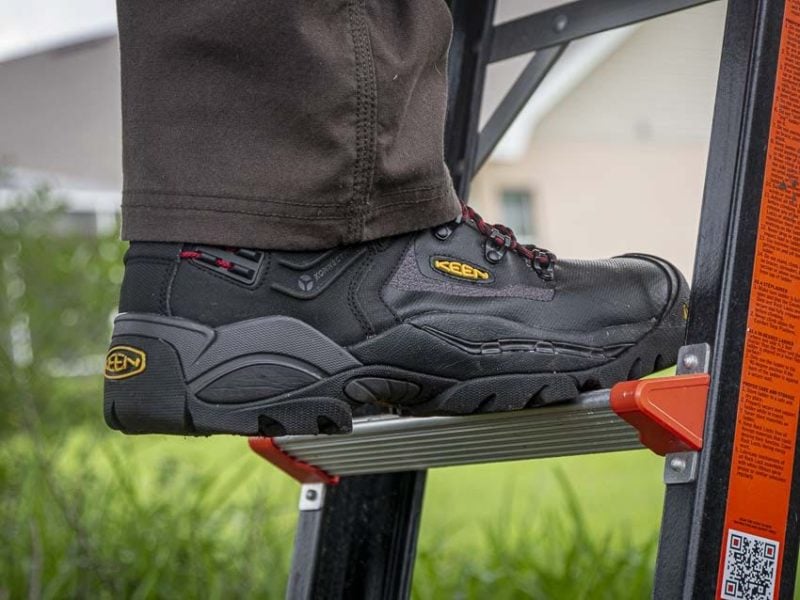 I really like KEEN Utility St. Paul works boots best for work on soft and uneven ground. Theyโre great on construction sites and in the OPE/landscaping industry when you want or need a safety toe and prefer a waterproof boot. If youโre working on concrete or asphalt all day, something like the KEEN Utility Dover is a more comfortable bet.