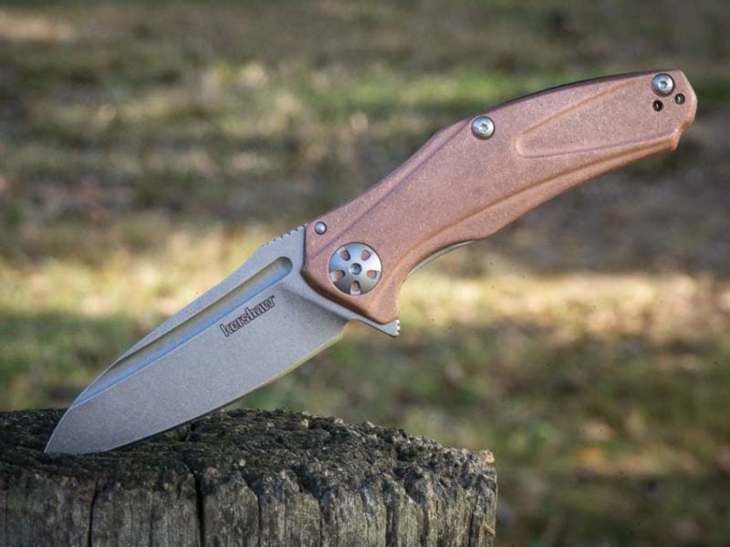 The Kershaw Natrix Copper (model 7006CU) adds a neat twist to the line. The knife features a bead-blasted copper handle. Over time, that copper—as with all true copper products—will develop a nice patina. That means your Natrix Copper knife will be unique to you and not look exactly like any other. While the handle material is the big deal, Kershaw also upgraded to a stonewashed D2 steel blade on this USA-made model. The blade finish looks great—as you’d expect. It should also hold an edge a bit longer than the 8Cr13MoV. The blade and knife also come in a bit smaller overall. The Natrix Copper measures just 6.4 inches long with a 2.75-inch blade. Though smaller, the copper handle adds some weight to the knife, bringing it up to 3.2 ounces. We felt that the additional heft gave it a more substantial feel for its size.