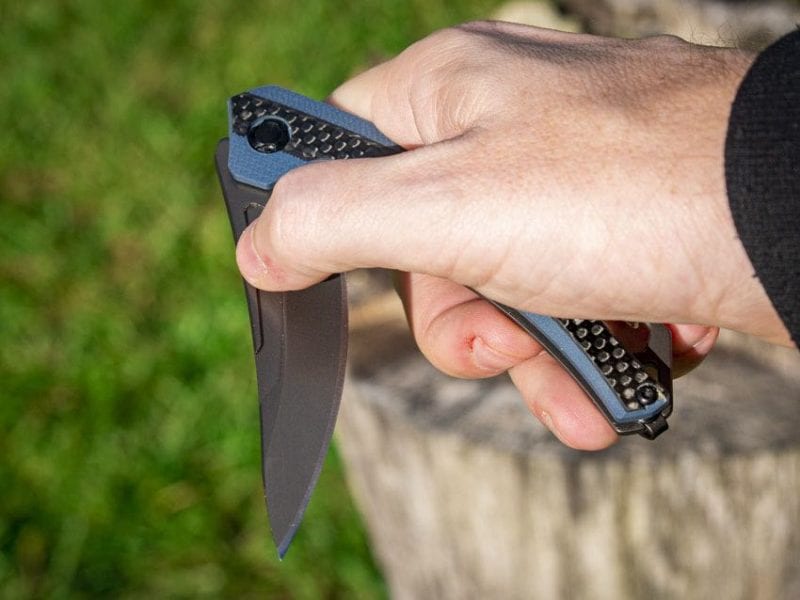The Kershaw Reverb XL has two different sides to its handle material choices. On the showy side, you have a blue-gray G10 handle offset with a carbon fiber overlay. The opposite side is stainless steel with a titanium nitro-carbide coating.