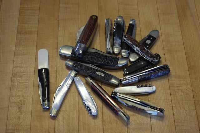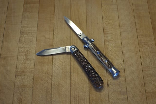 I have been a knife affascinato since about age 8 when I would accompany my father on visits to Mitchellโs Hardware Store in East Orwell, Ohio. While he picked up what he needed for the latest home repair project I would admire the knives in a wood display case at the counter. In the 1950s all hardwares sold switchblades. Of course, a switchblade was what I really, really coveted; however, my father would say, โyou are not old enough for a switchblade.โ What my father was really saying was that I was not old enough for a knife. I had to wait until age 11 when I joined Scouts, eared a totin chip patch (license for a scout to use axes and knifes) and obtained a Scout three blade Whittling Knife made by Camillus.