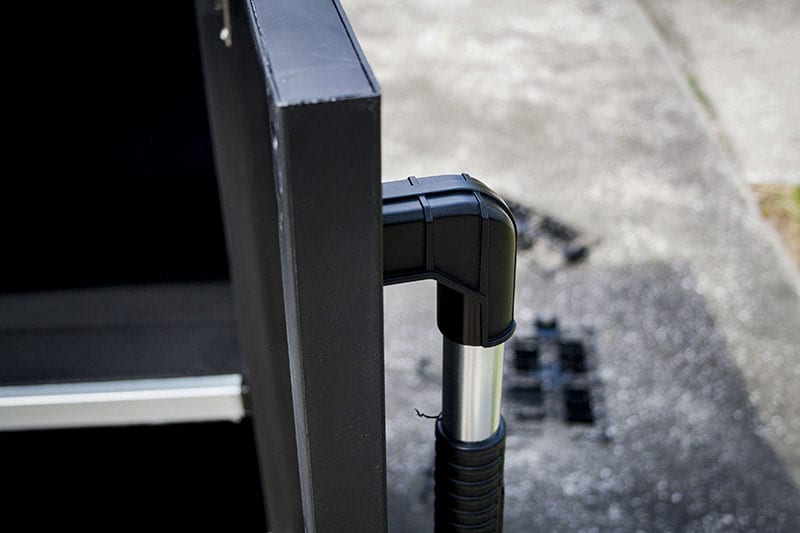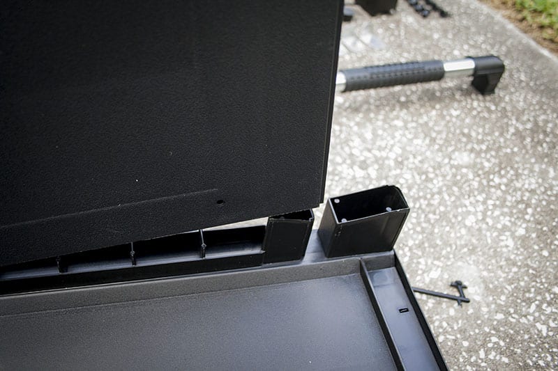 Flip the base over so that the feet rest on the ground and youโre ready to install the back and side panels. These slide pretty easily over the plastic protrusions on the base, just be sure that they are facing the right direction. The panels are molded such that you canโt put them together incorrectly, but at the beginning it wonโt stop you from trying! Keter doesnโt (and wouldnโt) suggest this, but I found it helpfulย toย gently tap the top of the panel with aย rubber mallet to be sure it was in the right place. Slide the all the panels together and then gently slide the top into the recesses along the tops of the back and side panels.