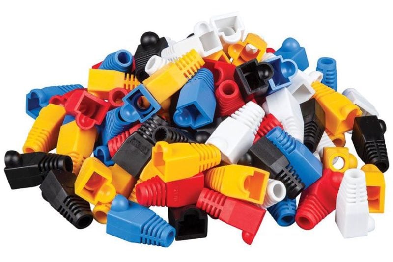 They come in black, white, blue, red, and yellow, and they work with all CAT5e and CAT6 cables.