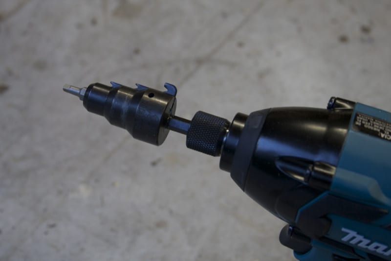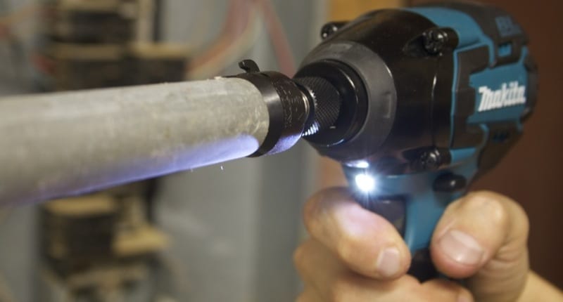 The Power Conduit Reamer runs about $26. It’s stepped, so it will automatically ream 1/2″, 3/4″, and 1″ conduit. The blade is also removable and replaceable, priced at less than $10 for a 2-pack. To remove it, you just use the included hex wrench, and take out the single threaded screw that’s recessed into the stepped head. I tested it on a Makita LXDT08 impact driver and some other tools and in each case it was a perfect pairing.