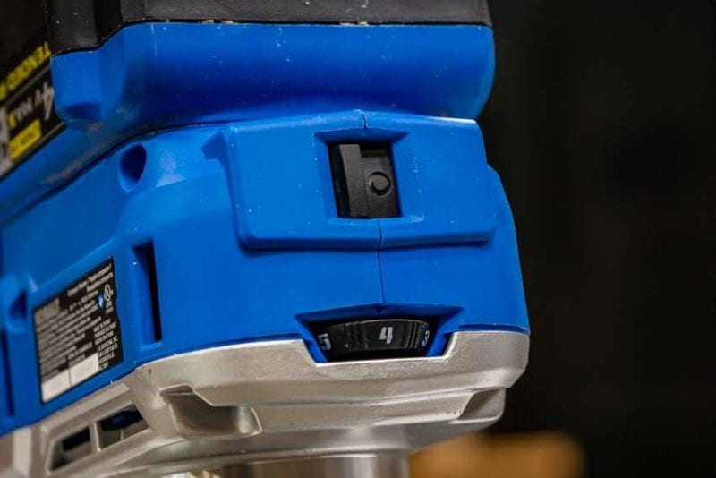 I like the layout of Kobaltโs controls. The power switch, variable speed dial, and depth adjustment are all on the front. The power switch is a standard no-frills mechanical switch.
