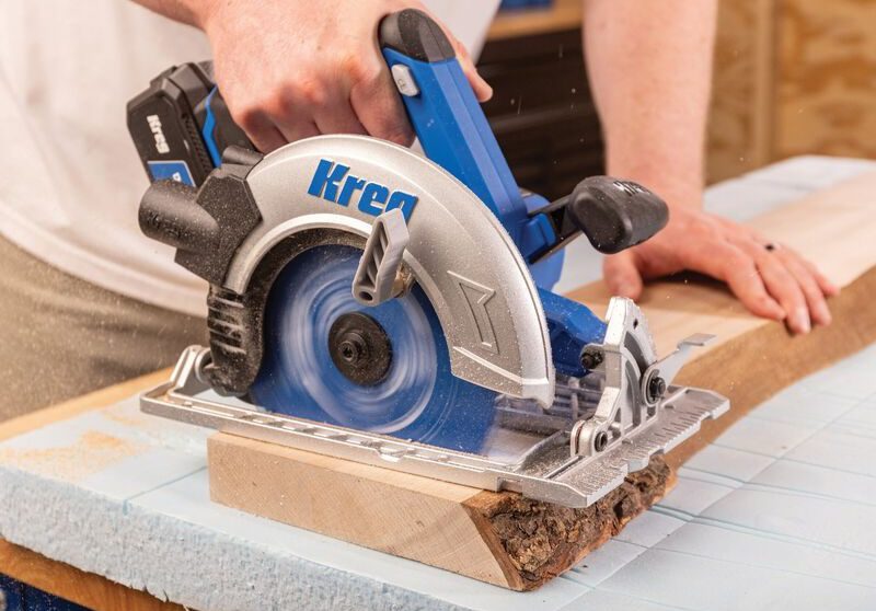 Next, we have the first of two circular saws in Kregโs cordless roster. This is the larger model, with a 7-1/4-inch blade. At 90ยฐ, it can cut up to 2-7/8 inches deep, and it can easily cut through 2x material at 45ยฐ, with a max depth of 1-7/8 inches at that angle. You can bevel it from 0ยฐ to 57ยฐ for a variety of cut types for any crafting/building project.