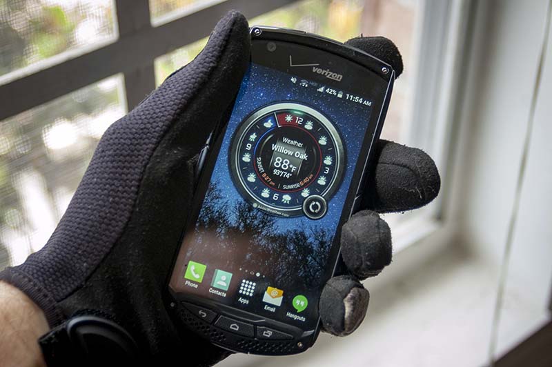 There are gloves sold with a touch screen fingertip for use with phones and tablets, but you wouldnโt trust them to protect your hands on the jobsite. Kyocera managed to find a way to make the touch screen sensitive enough to work when wearing gloves up to 3 mm thick. I was a bit skeptical as to how well this would work, but I had absolutely no problem navigating with my Klein journeymanย gloves on. Where I did have an issue was using the keyboard โ the small keys just arenโt conducive to gloved use.