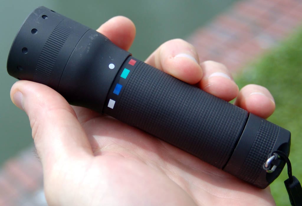The LED Lenser P7.2 flashlight updates the P7 and features 4 LED light colors: white, blue, green, and red. Its lens uses a prism diffuser that also gives a broader throw. Smart Light Basic Technology lets users go between High, Low, and Defense Strobe modes with sequential full or half clicks.