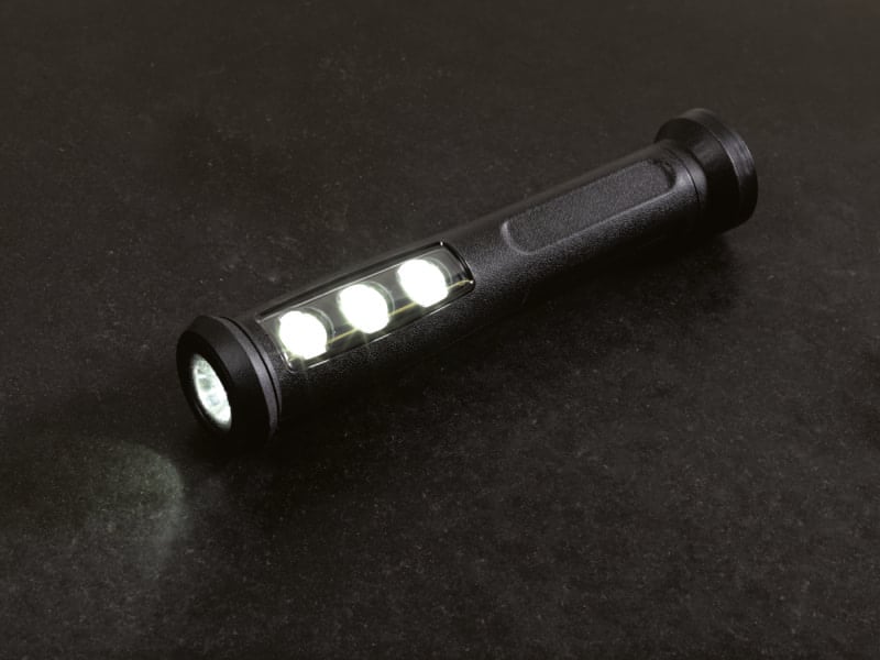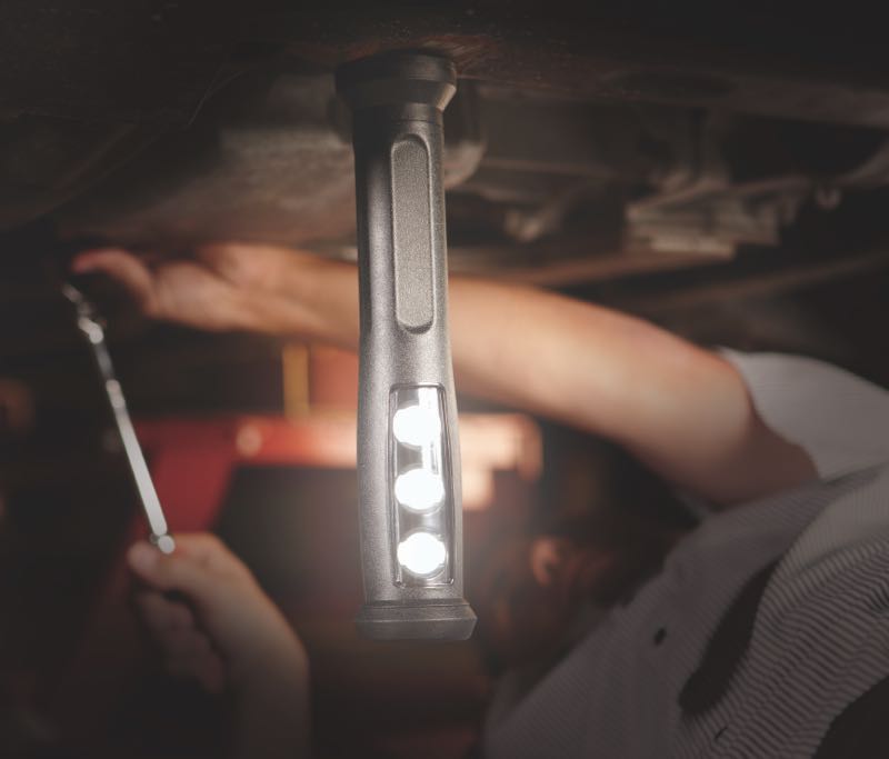 The Mac Tools Worklight features a polycarbonate casing with TPEย (thermoplastic elastomer) textured coating finish. This outer coating isย a sort of rubberized coating that gives the flashlight a good grip and protection from falls. Of course, while thatโs impressive, Macย Tools also made the new LED Work Light water resistant โ the switch isย 100% sealed from water, dirt, and dust. Of course, allย of this is backed up with an IP54 rating.