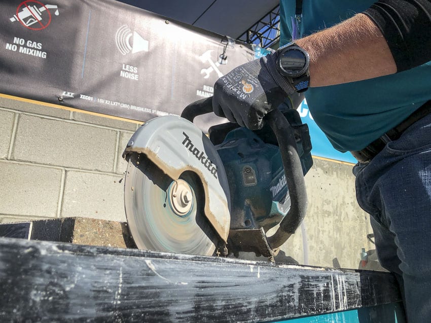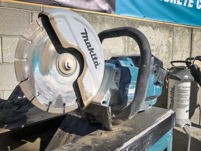 We got our hands on the Makita XEC01 power cutter at the 2020 World of Concrete. We used it to make several cuts in fairly dense concrete pavers with a lot of aggregate. While you can stall out any saw if you push it hard enough, we felt the Makita 36V 9-inch power cutter allowed for reasonably quick cutting speeds. When pushed really hard, you could engage the electronic clutch (Automatic Feedback Technology or AFT) which safely stops the blade.