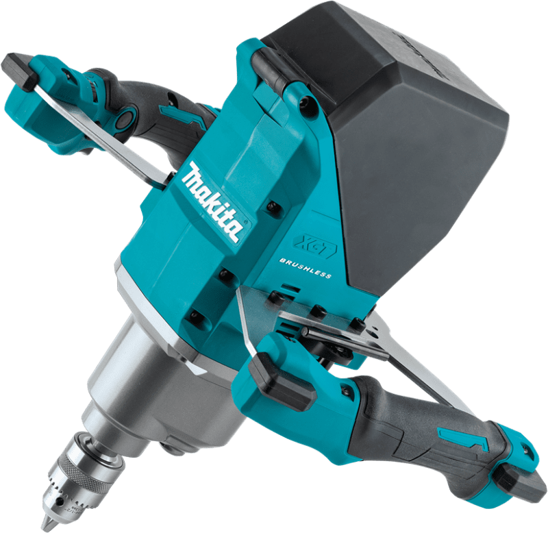 The GTU01 mixer moves from the rear-handle design of Makitaโs 18V model to a dual-handle design that aims to provide better control. It weighs 13.5 pounds including the kitted 4.0Ah battery, so this handle design gives you leverage on both sides to manage that weight.