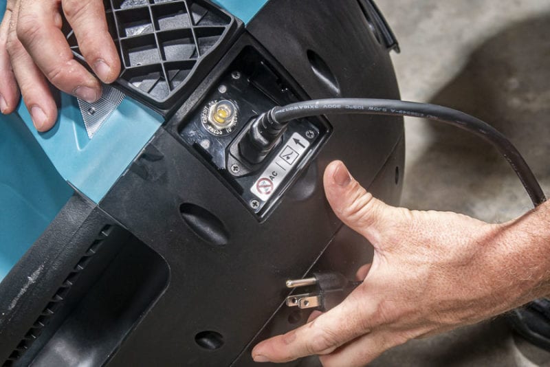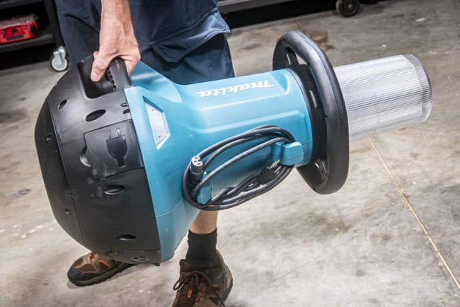 You do, however, have the option to forgo the cord and use Makitaโs 18V battery platform instead. Though the light holds two 18V batteries, it draws power from just one pack at a time. Plus, should you run the light from the wall outlet and the power goes out, the light seamlessly switches to battery backup power.