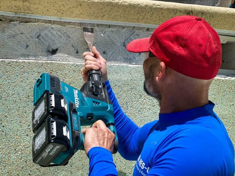 The guys at Aqua Res-Q took to the tile with both tools. It was a race from the stairs to see who could make it all the way around the perimeter. The Makita XRH08 dominated the race, chipping with a lot more authority and precision. However, that task wasnโt a sufficient test for a tool with its capabilities. For that, weโd need to interview the guys about using the tool when chipping through a lot more concrete.