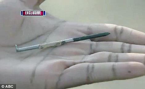 Now, Dennis is a self-employed builder from New Jersey. As we all know, a 3-1/2″ nail has no business being in your chest. Dennis went into near-immediate cardiac arrest and was transported, first via ambulance, then via helicopter, to Cooper University Hospital in Camden for surgery. During the initial ambulance ride he apparently had to be resuscitated. Once at the university hospital, a team of cardiac and trauma surgeons worked on him to repair the damage. The process actually included bypassing his heart (stopping it) for a full 40 minutes.