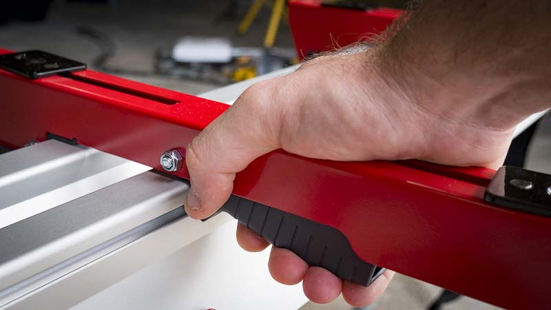 Support wings come out to both the left and right to give you up to 100 inches of reach. A thumbscrew locks it in place. The wings slide easily and the screw locks them securely, but the metal-on-metal connection will likely leave some blemishes pretty quickly. Itโ€™s a jobsite tool โ€“ are you really worried about surface scratches?