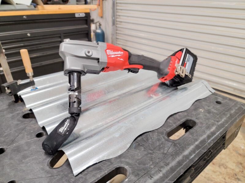 As for cut capacity, this nibbler can confidently chew through 10-gauge mild steel, 12-gauge stainless steel, and even 9-gauge aluminum, and has a minimum cut radius of 2 inches. This is also an improvement over the corded model with its slightly larger radius of 2.5 inches.