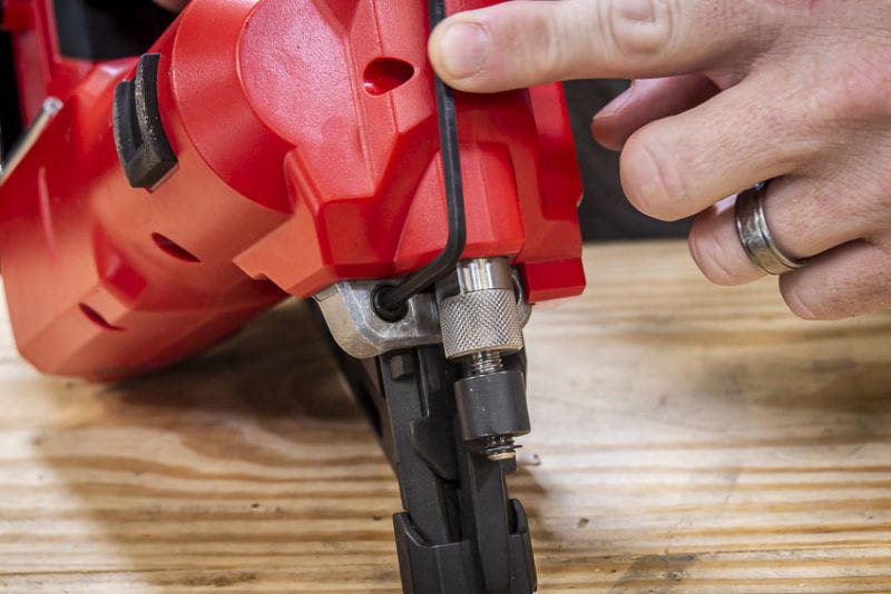 If you get a jam, thereโs enough access to get a pair of needle-nose pliers around the offending nail. If you still canโt quite get it, the Allen wrench stores conveniently along the right side of the nailer to remove the magazine.