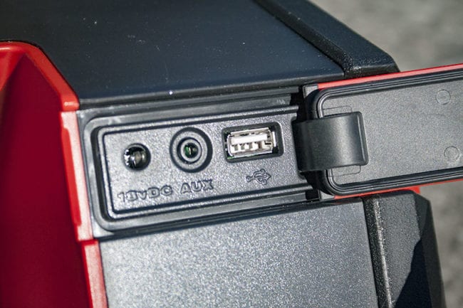 Five control buttons are located on top of the unit: the power button, Bluetooth button, and auxiliary button will all illuminate when powered on while the two volume buttons will not. The back of the speaker houses either a Milwaukee 18V or 12V battery. Beneath a small rectangular cover (held on by a rubber strap to prevent loss) are a jack for the AC adapter, headphone jack, and USB port to connect auxiliary devices.