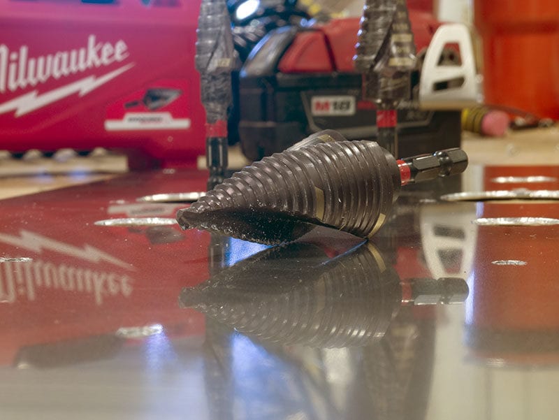 Itโs quite common to drill through aluminum and stainless steel, the two materials that will typically doom a step bit. Even with a generous amount of oil, itโs hard to keep my normal bits working for more than a couple of days. Since these shop bits arenโt impact-rated like theย Milwaukee Step Bits, Iโm consigned to drilling at low RPM to preserve sharpness. Slow to drill and quick to dull โ itโs not a great combination! So I inserted one of the Milwaukee bits into my impact, and away I went.