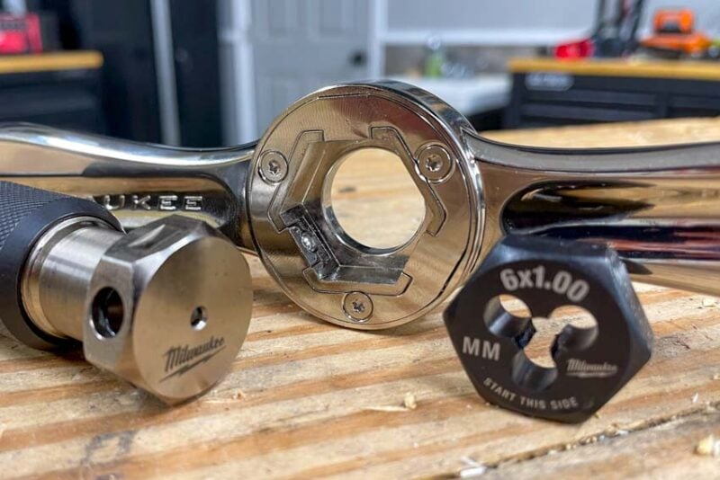 Second, many sets require different handle sizes. Milwaukee created a single Hex-LOK handle to tackle both taps and dies across the entire size range. The chrome handle is just under 9 inches long with curved edges that are comfortable in your hand. A 1-inch hex interface holds the threading dies or the tap collet and requires no tools to install either.