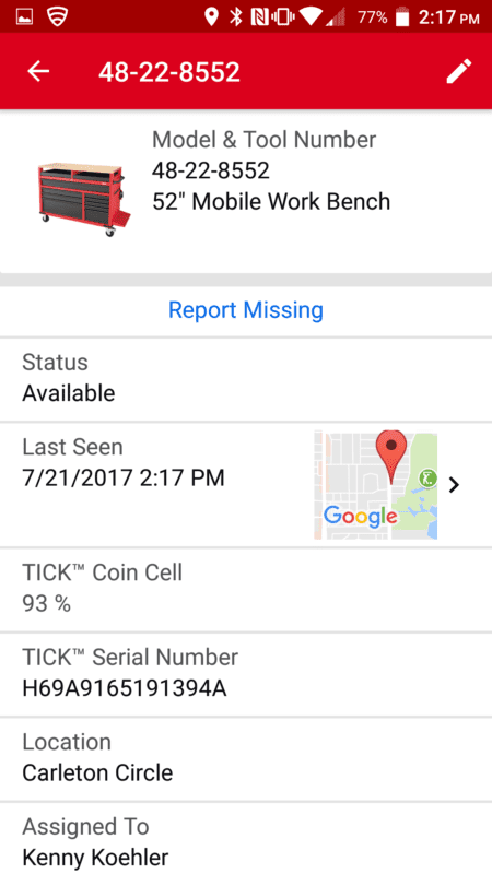 Once you hit save, youโ€™ll be able to see most of that information on the screen when you select the Tick. If you put it on a Milwaukee product, the app will load a picture of the tool. Two of the coolest features are the ability to see where One-Key last detected your Tick and the battery level remaining in it. Seeing the battery level is a huge advantage to staying on top of replacement batteries.