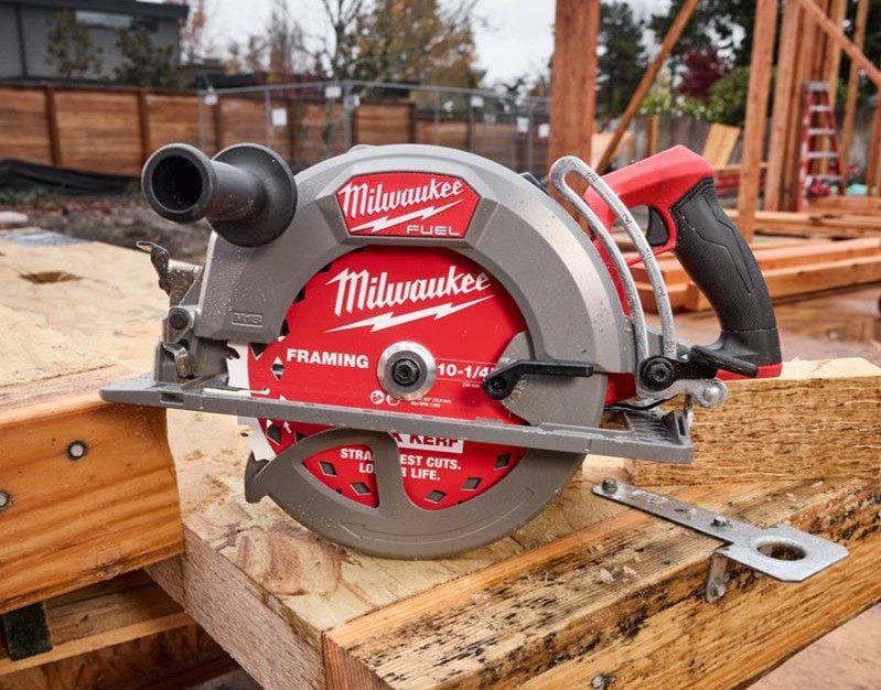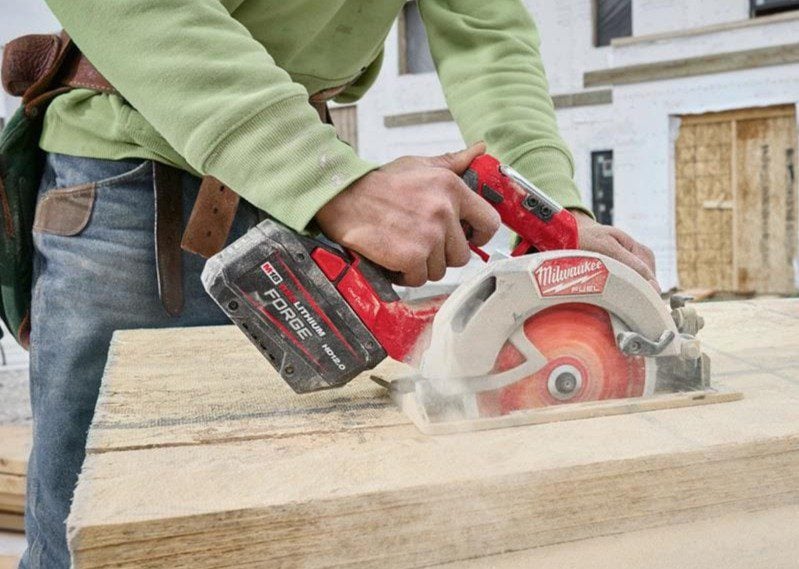 Milwaukeeโs cordless 10 1/4-inch circular is the brandโs first battery-powered saw of this size. It features a 3 13/16-inch cut depth at 90 degrees, giving it the ability to cut up to 4x lumber in a single pass. Plus, it weighs just 10.3 pounds as a bare tool, which Milwaukee claims makes it the lightest-weight circular saw in its class. Using a 12.0Ah Forge battery, this saw can complete up to 250 cuts per charge in 4ร4 material.